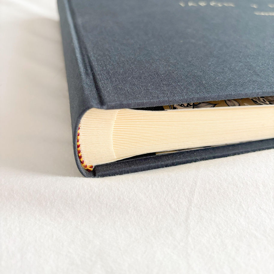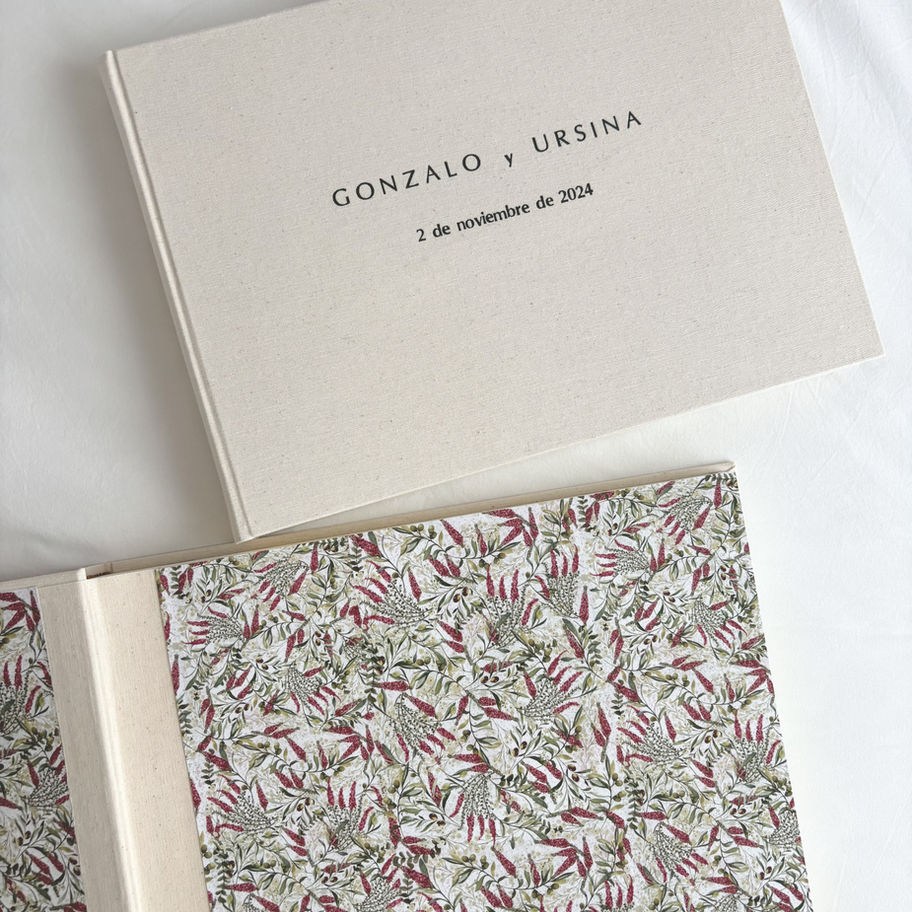 Nombres de los novios grabados con película beige, azul marino o verde oscuro (a juego con las guardas y con la tela del album).